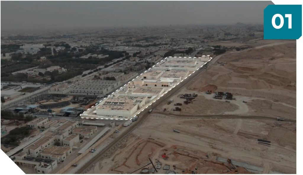 الدور الأرضي يشمل: 3 مكاتب، مطبخ تحضيري، 8 دورات مياه، ورشتين، ومستودع، بمساحة (2600م²)، وتم احتسابها ضمن الدور الأرضي.